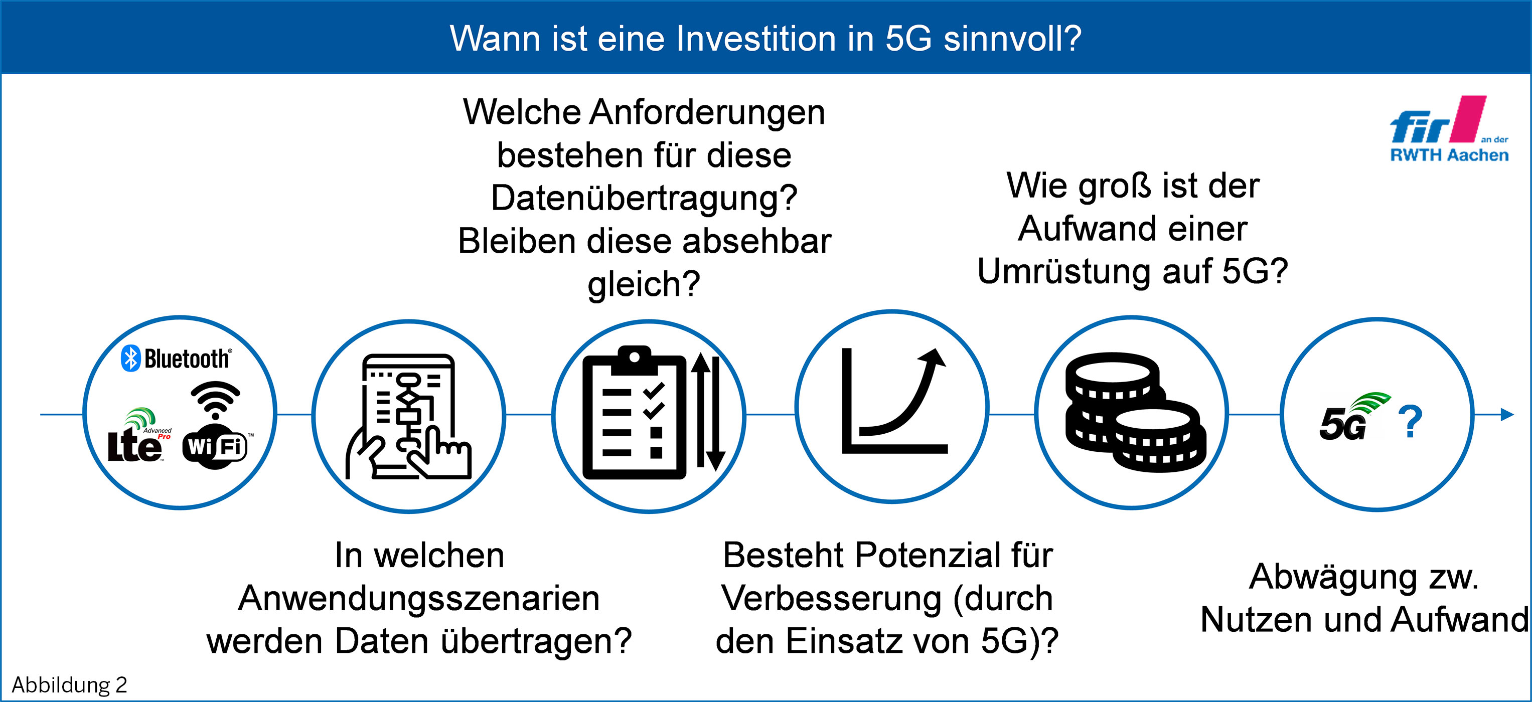 Zum Einstieg haben wir am FIR an der RWTH Aachen eine Übersicht aus Fragen erarbeitet, die vor einer Investition in 5G beantwortet werden müssen: