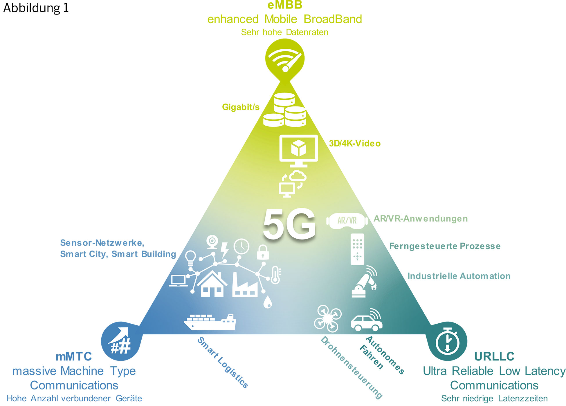 Abbildung 01: 5G-Anwendungsdreieck (s. “5G: Evolution oder Revolution?” Whitepaper, Center Connected Industry, FIR, 2019)