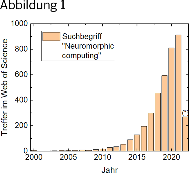 Ähnlich dem menschlichen Gehirn sollen biologisch inspirierte Computer Datenspeicher und Rechenoperationen verknüpfen und lernfähig sein – und so nicht nur viele Aufgaben deutlich schneller lösen als aktuelle Computer, sondern auch den Energieverbrauch reduzieren [1]. Solche neuromorphen Architekturen können insbesondere in der Bildverarbeitung, im maschinellen Lernen, für neuronale Netze und viele andere aktuelle Probleme genutzt werden, in denen mögliche Lösungen zurzeit noch durch unzureichende Rechenleistung verhindert werden – wie beispielsweise bei der Entwicklung autonomer Fahrzeuge. Aufgrund dieser zahlreichen Einsatzmöglichkeiten nimmt die Forschung zu neuromorphem Computing deutlich zu, wie Abb. 1 zeigt.