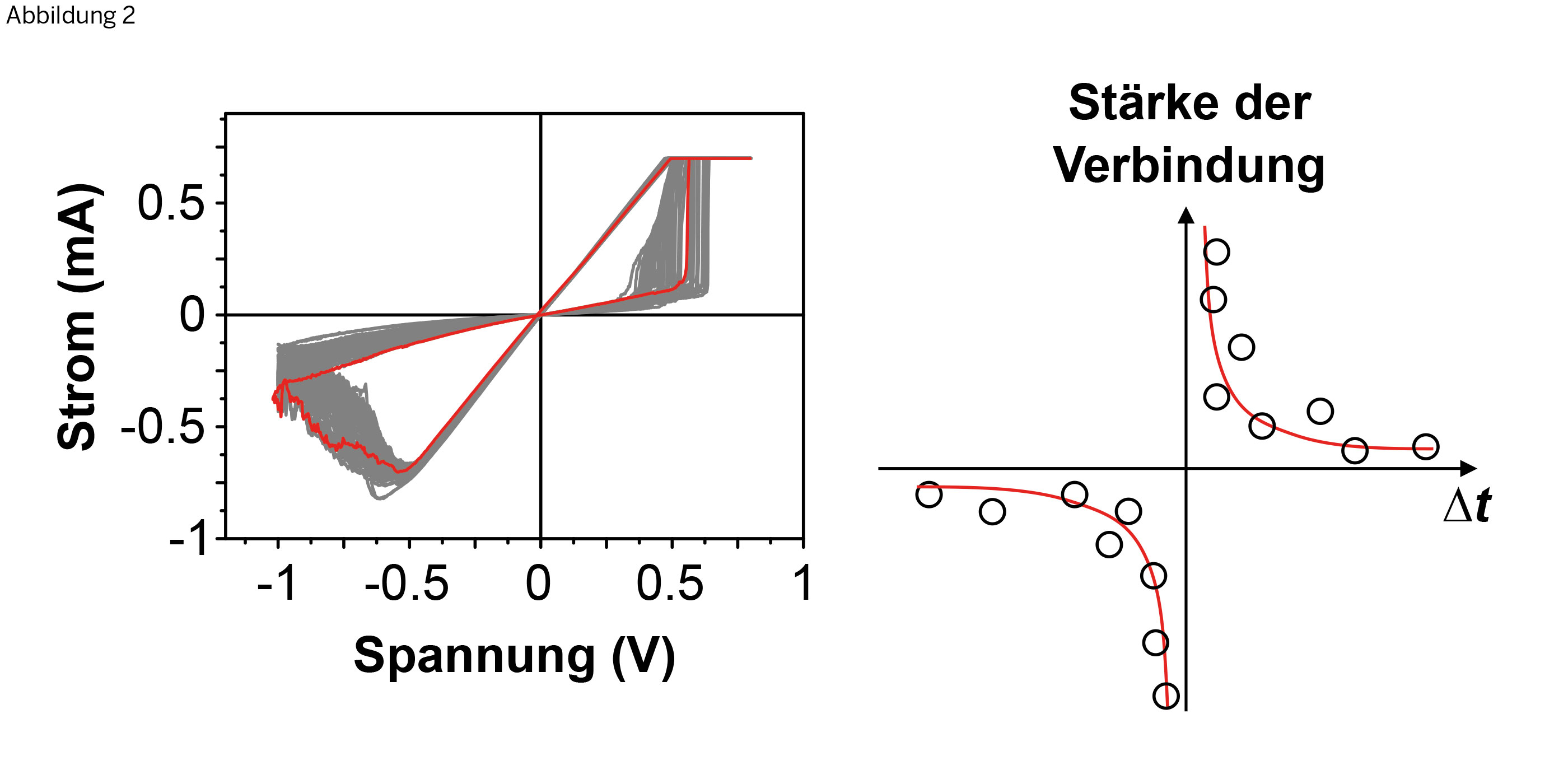 Durch ihr analoges Verhalten in Kombination mit ihrer Strom-Spannungs-Hysterese (Abbildung 2) und einer starken nicht-linearen Schaltkinetik sind memristive Systeme besonders vorteilhaft zur Realisierung von Nano-Synapsen. Zum Beispiel lässt sich mit ihnen die so genannte Spike Time Dependent Plasticity (STDP) emulieren. Im Wesentlichen ist STDP ein Mechanismus, bei dem Synapsen die Informationsübertragung zwischen zwei Neuronen davon abhängig machen, in welchem zeitlichen Versatz ∆t die Neuronen auf einen Reiz reagieren. Erfolgt eine Reaktion des zweiten Neurons nach dem ersten Neuron (∆t>0), so wird die Verbindung der Neuronen gestärkt und umgekehrt geschwächt (Abbildung 2). Auf diese Weise verarbeiten neuronale Systeme Information mit hoher Effizienz. In Analogie zum biologischen Vorbild findet auch hier die Informationsverarbeitung und Speicherung am gleichen Ort mit hoher Energieeffizienz statt.