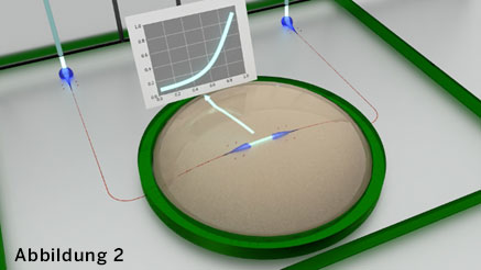 Abbildung 2: Schematische Darstellung einer nanophotonischen Schnittstelle zu molekularen Komplexen in flüssigen Lösungen mit optisch nicht-linearem Verhalten zwischen Eingangs- und Ausgangs-leistung. (© AG Schuck.)