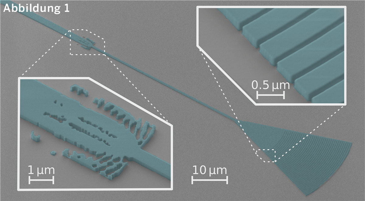 Abbildung 1: Rasterelektronenmikroskop-Aufnahme eines mittels inversem Design entwickeltem optischen Modenwandlers (links) und einem konventionellem optischen Gitterkopplers (rechts). (© AG Schuck.)