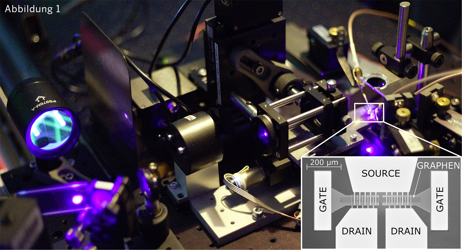 Abbildung 1: Fotografie des Messaufbaus zur 3D Bildgebung mittels eines Graphen basierten Photo-Misch-Detektors. Eine einzige Atomlage Kohlenstoff dient hier als photoaktive Fläche. (© Lehrstuhl für Höchstfrequenztechnik und Quantenelektronik der Universität Siegen)