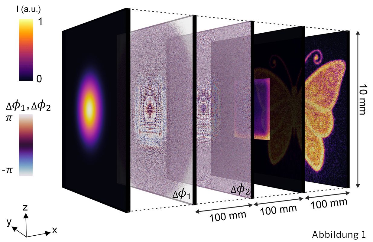Der entwickelte Algorithmus erlaubt die kombinierte Optimierung von Intensität und Phase in mehreren Zielverteilungen und damit die Kontrolle über eine dreidimensionale Feldverteilung. Damit kann für eine gewünschte Intensitätsverteilung beispielsweise gleichzeitig eine ebene Phasenfront in der Zielebene realisiert werden. Durch die Optimierung für mehrere Zielverteilungen kann der Strahl unterschiedliche Profile entlang der Propagationsrichtung annehmen. So könnte beispielsweise die Veränderung der Intensitätsverteilung nach dem DNN so erfolgen, dass aus einem Top-Hat eine Ringverteilung wird. Eine weitere Anwendung liegt in der robusten Laserstrahlformung. Hierbei wird das DNN so trainiert, dass für in der Eingangsebene verschobene Eingangsstrahlen ein möglichst gering verändertes Ausgangsprofil erzeugt wird. Das optische System wird dadurch robust gegenüber Dejustage. In dem von der europäischen Union geförderten Projekt Made-to-measure micromachining with laser beams tailored in amplitude and phase (METAMORPHA) arbeiten Industrie und Forschung, darunter auch das Fraunhofer-Institut für Lasertechnik ILT und der Lehrstuhl TOS, an einem optischen System mit zwei kaskadierten SLMs und einem integrierten Galvoscanner. Ziel ist, durch gleichzeitige dynamische Kontrolle von Amplitude und Phase der Feldverteilung eine Lasermikrobearbeitungs-plattform aufzubauen, die viele konventionelle und auch umweltschädliche Fertigungsverfahren ersetzen soll.
