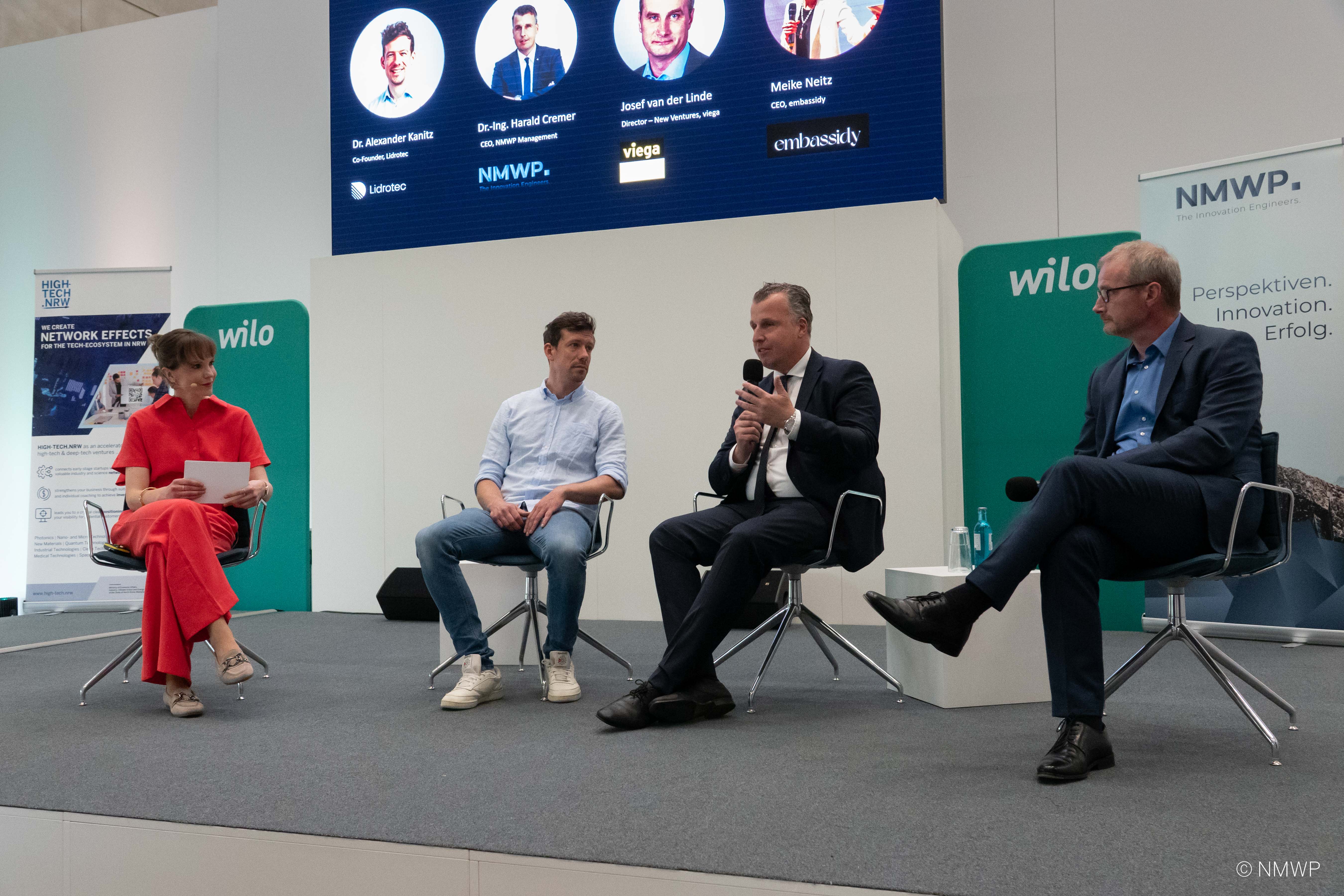 Mehr als zeitgemäß war auch das Thema der Paneldiskussion, das das Zusammenwirken von KMUs, Industrie, Acceleratoren und Tech-Start-ups in NRW einordnet: „Wie Tech-Startups mit Industrie und Mittelstand kooperieren können, und welche Rolle Acceleratoren dabei spielen.“ Darüber sprach Moderatorin Meike Neitz (embassidy) mit Dr.-Ing. Harald Cremer (NMWP Management GmbH), Alexander Kanitz (Lidrotec GmbH, HIGH-TECH.NRW Alumnus) und Josef van der Linde (Viega GmbH & Co. KG). Es entfaltete sich ein einnehmendes Gespräch, das die Startpunkte von Industrie, Unternehmen und Start-ups offenlegte und zeigte, wie fruchtbar eine funktionierende Kooperation sein kann.