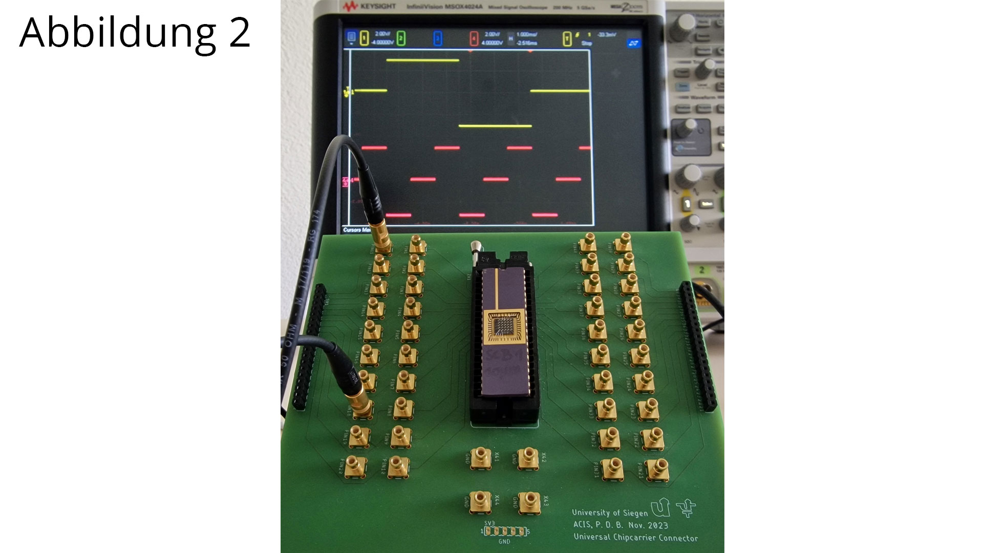 Abb. 2: Fotografie einer Memristorprobe verbunden mit einem Messaufbau. Funktionsgeneratoren liefern passende Eingangsignale, um die mit Memristoren aufgebaute ternäre Logik zu testen.