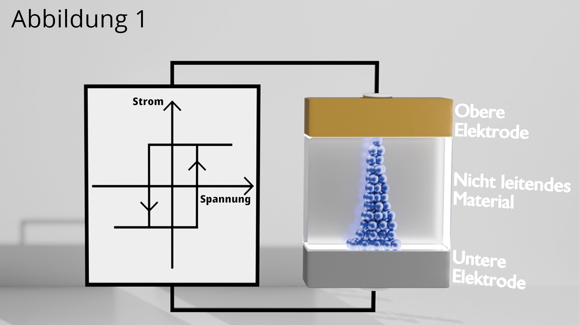 Abb. 1: Computergenerierte Darstellung einer Memristorstruktur mit einem leitfähigen Filament innerhalb eines nicht-leitenden Materials. Auf der linken Seite des Memristors wird eine Messung mit einer typischen Hysteresekurve dargestellt.