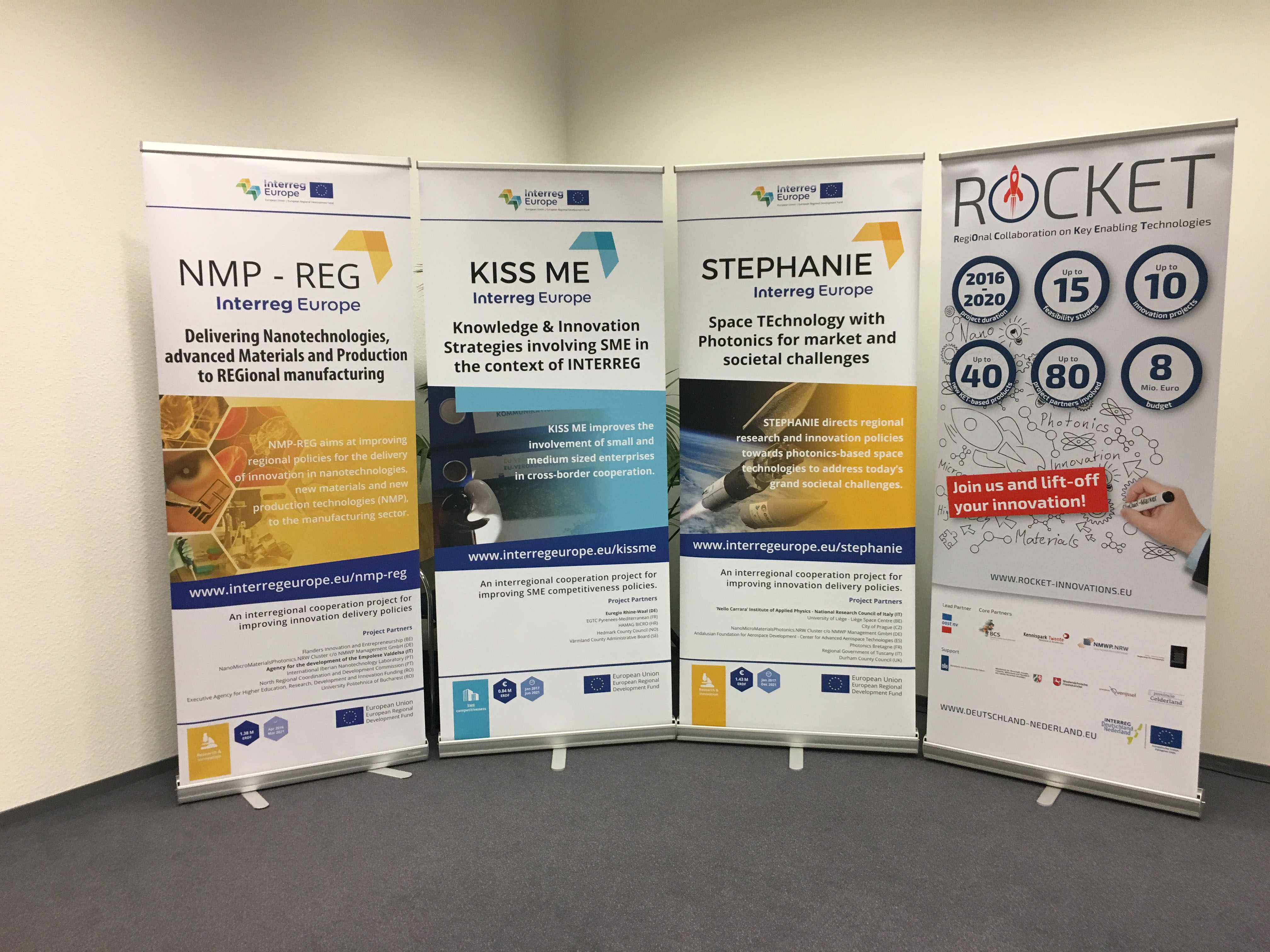 „ROCKET“ steht für RegiOnal Collaboration on Key Enabling Technologies und fördert die grenzüberschreitende Zusammenarbeit zwischen Wirtschaft und Wissenschaft im deutsch-niederländischen Grenzgebiet zwischen Nordsee und Niederrhein zur Stärkung von Forschung, technologischer Entwicklung und Innovation. Im Fokus stehen Schlüsseltechnologien (KET, Key Enabling Technologies) wie Nanotechnologie, Mikrosystemtechnik, Mikro- und Nanoelektronik, innovative Materialien und Werkstoffe sowie Photonik. Dieses Projekt wird im Rahmen des INTERREG-Programms von der Europäischen Union und den INTERREG-Partnern finanziell unterstützt.