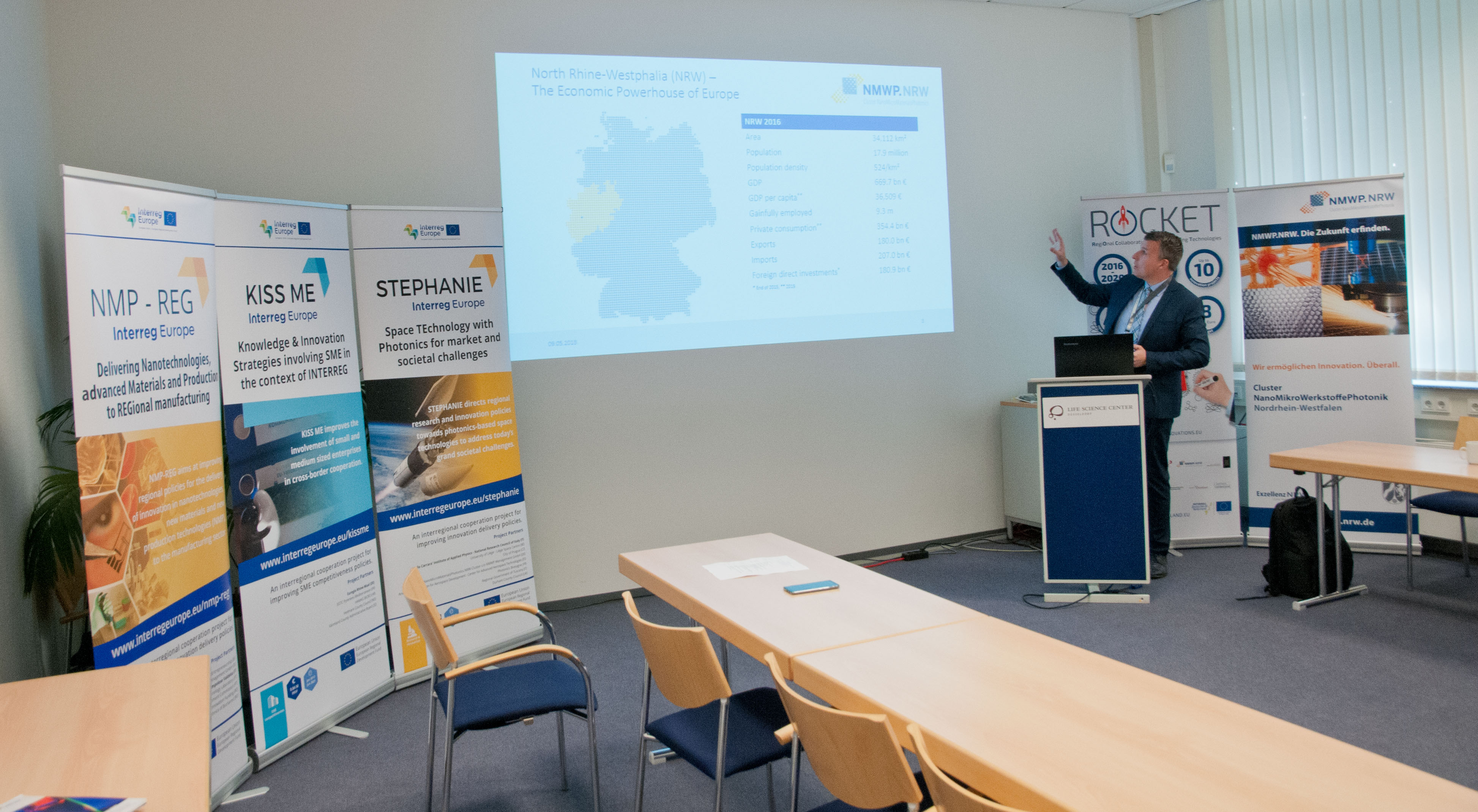 Als Best Practice-Beispiel für regionale und grenzüberschreitende Innovationsförderung im Bereich der Schlüsseltechnologien wurde der Cluster NanoMikroWerkstoffePhotonik.NRW am vergangenen Mittwoch im Rahmen einer Vor-Ort-Besichtigung von den Projektpartnern des InterregEurope-Projekts „KISS ME“ besucht. Der Besuch war jedoch mehr als nur ein „Best-Practice-Beispiel“ aus NRW – mit „STEPHANIE“, „NMP-REG“ und „KISS ME“ haben sich erstmals alle drei Interreg Europe-Projekte mit Beteiligung aus NRW zu einem gemeinsamen Erfahrungsaustausch in Bezug auf Innovation getroffen. Die drei Projekte geben wichtige strategische Impulse für die Ausgestaltung zukünftiger Entwicklungen in den beteiligten Regionen Europas.