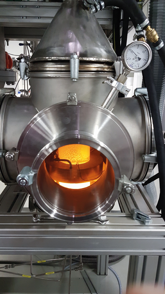 - Sprayflammenreaktor während der Synthese Schaugläser im Laborreaktor ermöglichen es, den Verbrennungsprozess zu beobachten. Dies ist gerade bei Versuchen mit neuen Vorläufern sehr wichtig, da auch die Qualität des Sprays/der Sprayflamme einen Einfluss auf die Qualität des entstehenden Produkts hat.