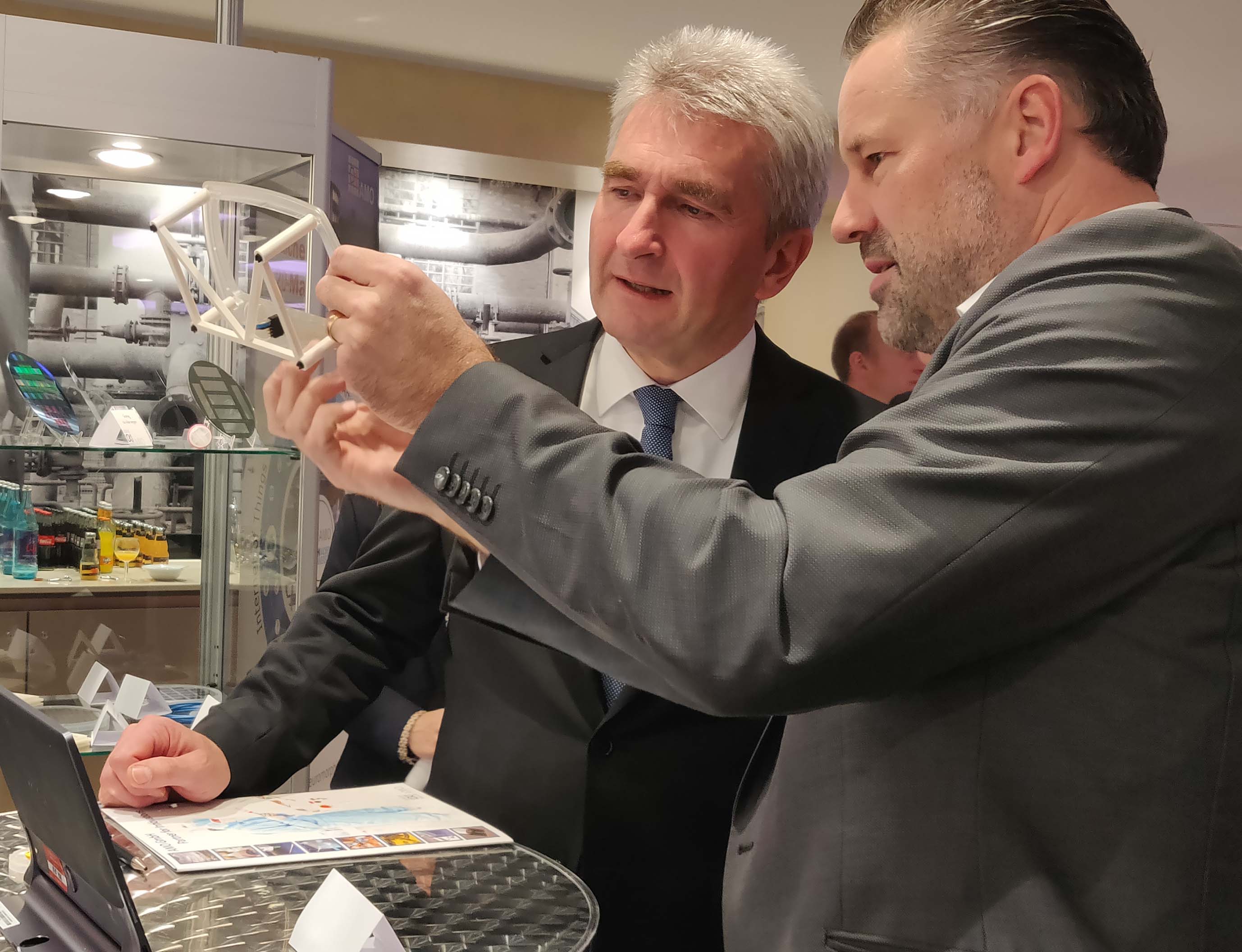Im Rahmen der 8. NRW Nano-Konferenz in Dortmund besuchte NRW-Wirtschaftsminister Andreas Pinkwart den Messestand der AMO GmbH, um sich mit RWTH-Professor und AMO-Geschäftsführer Max Lemme über die aktuelle Forschung im Aachener Center für Graphen & 2D-Materialien im Bereich der Nanotechnologie und zweidimensionalen Materialien (Graphen) auszutauschen. Dabei konnte Prof. Lemme die Mission der AMO als Pfadfinder für neue Technologien und deren Transfer in die Anwendung durch Verbund-Forschungsprojekte und Ausgründungen erläutern.