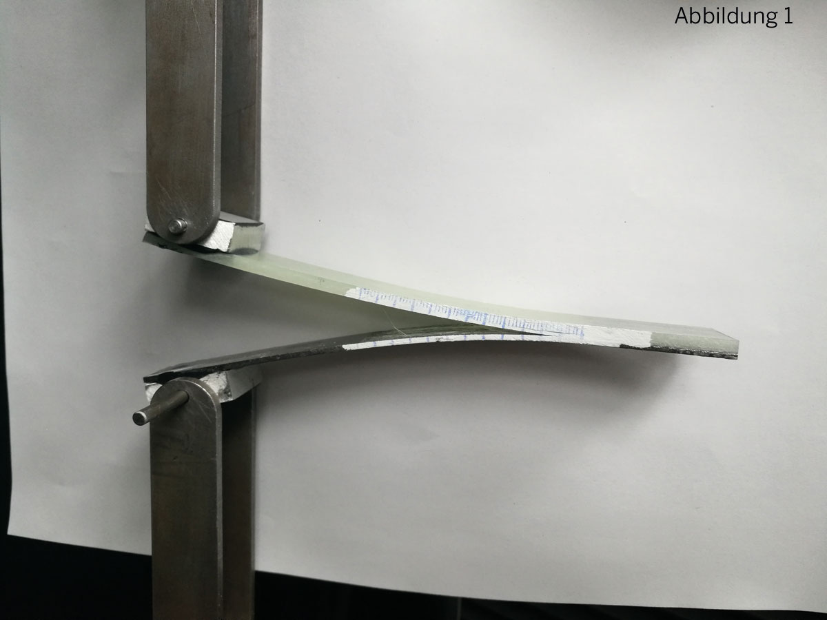 Abbildung 1: Schälversuch an einer Probe aus GFK (obere Schicht) und Stahl (untere Schicht).