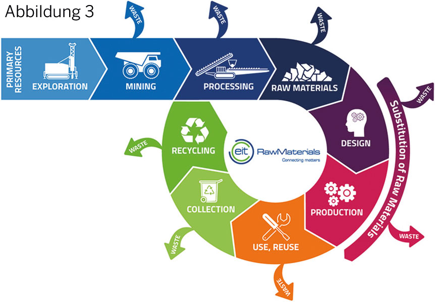 Abbildung 3: Die Rohstoff-Wertschöpfungskette mit Ansatzpunkten für Circular Economy, © EIT RawMaterials