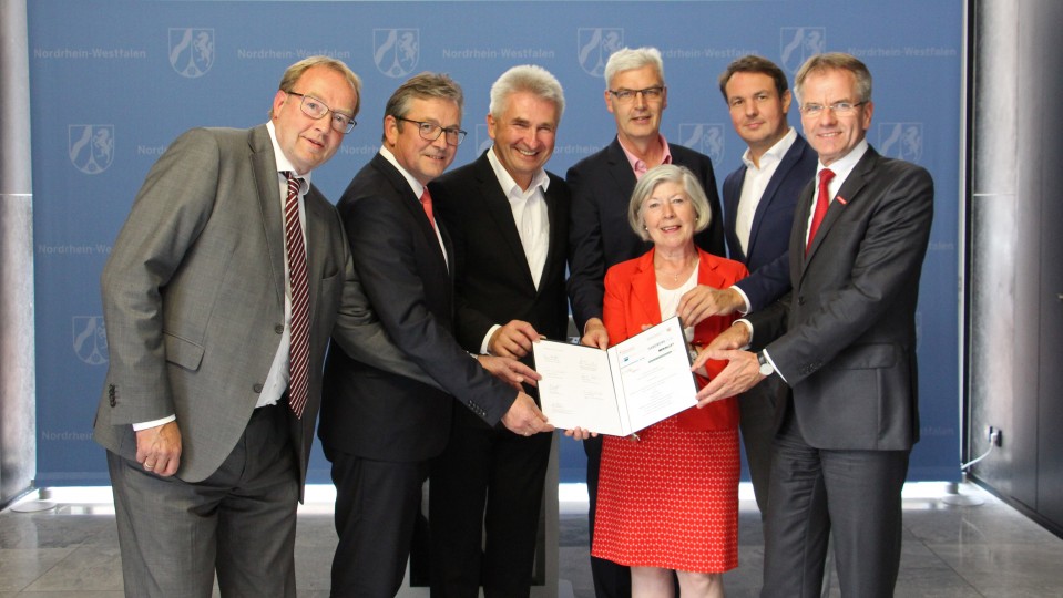 Die Gemeinsame Erklärung zur NEUEN GRÜNDERZEIT NORDRHEIN-WESTFALEN unterzeichneten IHK NRW, Handwerk.NRW, unternehmer nrw, NRWalley - Bundesverband Deutsche Startups, die Kommunale Wirtschaftsförderung NRW sowie der Verband der Wirtschaftsförderungs- und Entwicklungsgesellschaften in NRW zuvor im Wirtschaftsministerium. Sie finden diese und das zugehörige Konzeptpapier unter www.gründen.nrw.