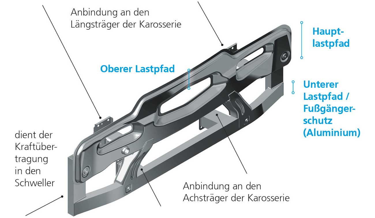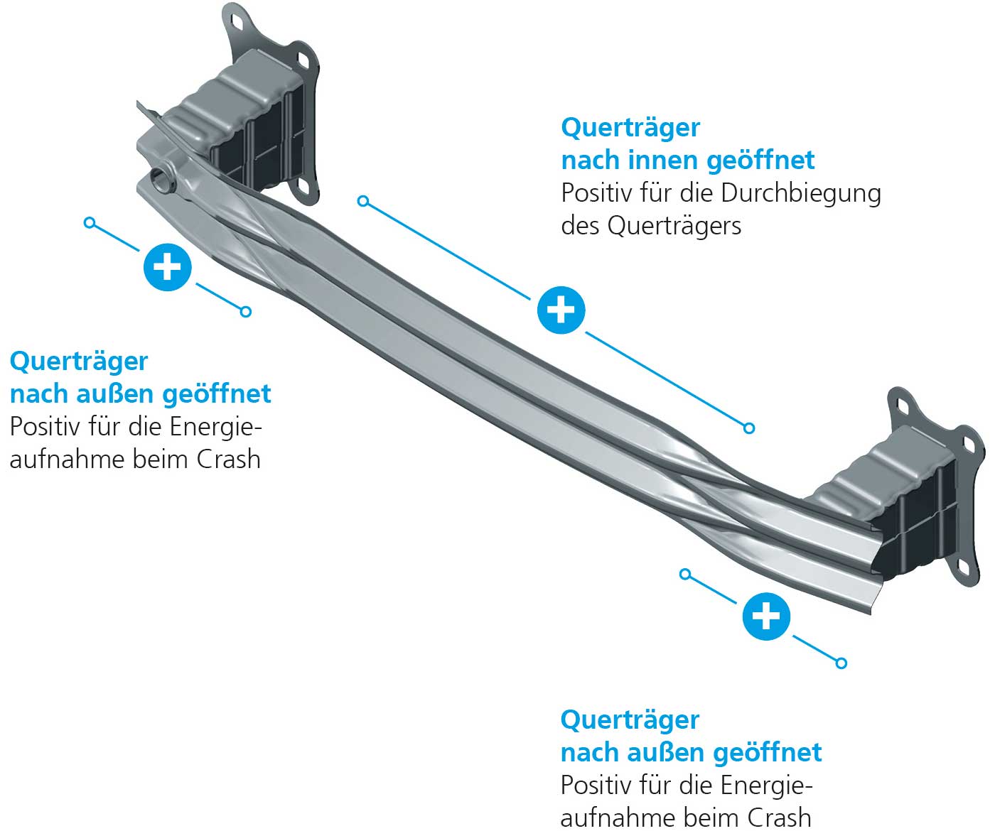 So wird zum einen die Performance des Querträgers verbessert und zum anderen die Anbindung längerer Crashboxen möglich, wodurch mehr Energie absorbiert werden kann. Darüber hinaus zeigt das Profil mit wechselnder Öffnungsrichtung Robustheit gegenüber Torsion. Durch den Verzicht auf ein Schließblech verringern sich Gewicht, Material- und Prozesskosten.