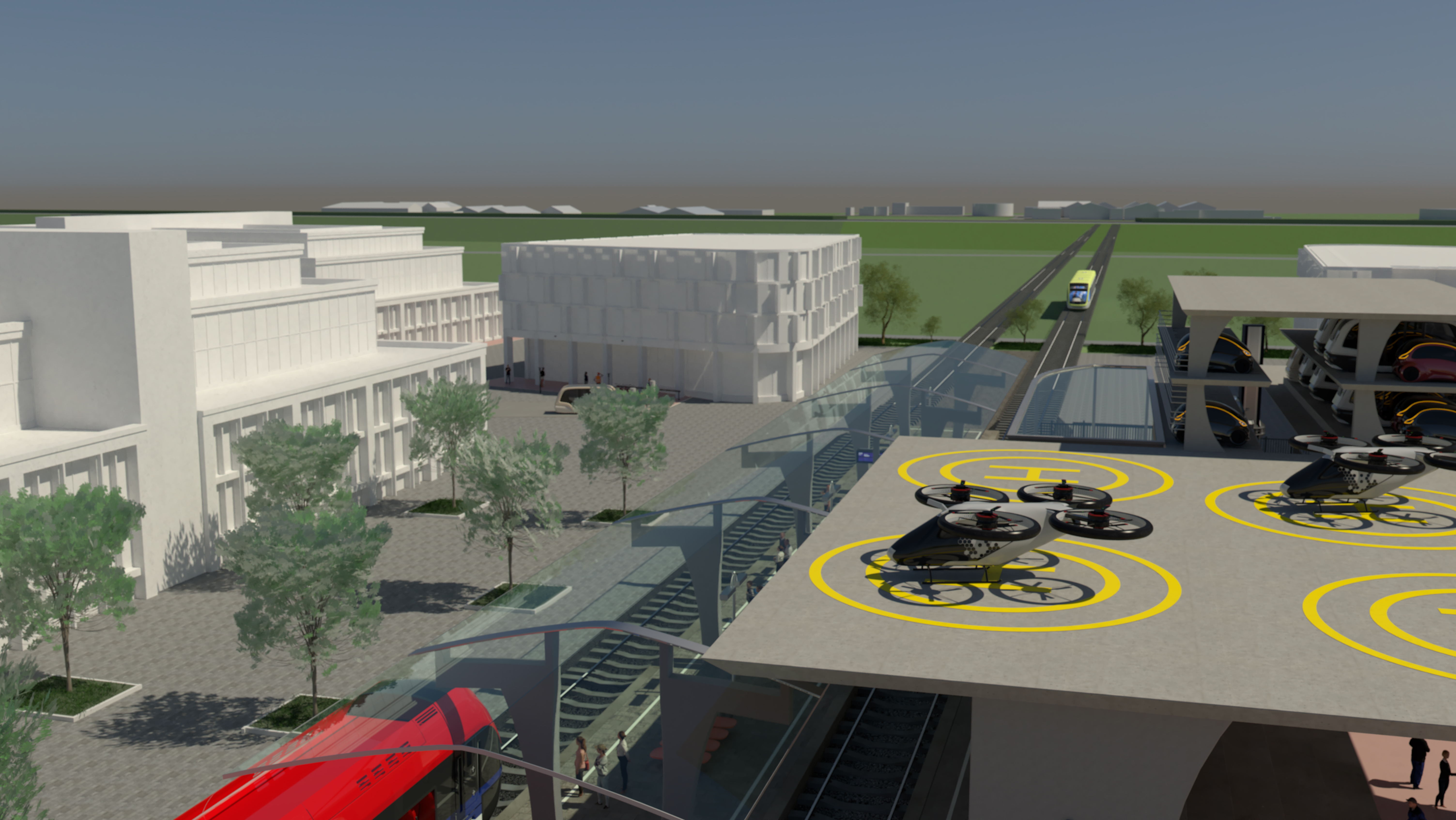 Animation: Hier wird die Mobilität der Zukunft neu gedacht: Die Grafik zeigt, wie der Standort Merzbrück als luftfahrtaffines Gewerbegebiet aussehen könnte. Ein Mobilitäts-Hub soll den Landeplatz mit dem öffentlichen Verkehrs- und Radnetz der Region verknüpfen. Urheber: TEMA AG