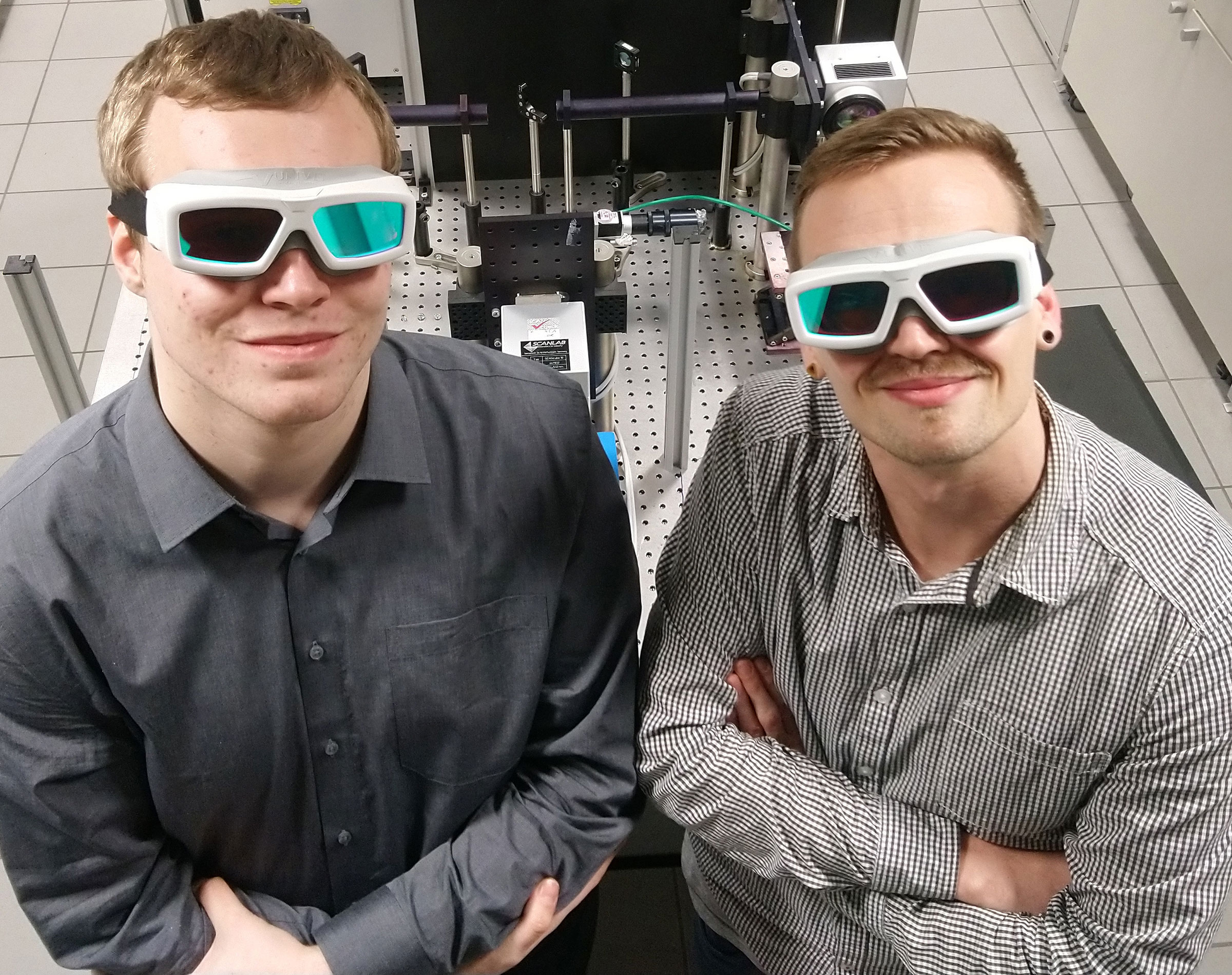 Abbildung 3: Das Gründerteam im Laser-labor mit typischer Laserschutzbrille, Tobias Bessel (links) und Dr. Friedrich Waag (rechts). © Yaya Li, Universität Duisburg-Essen