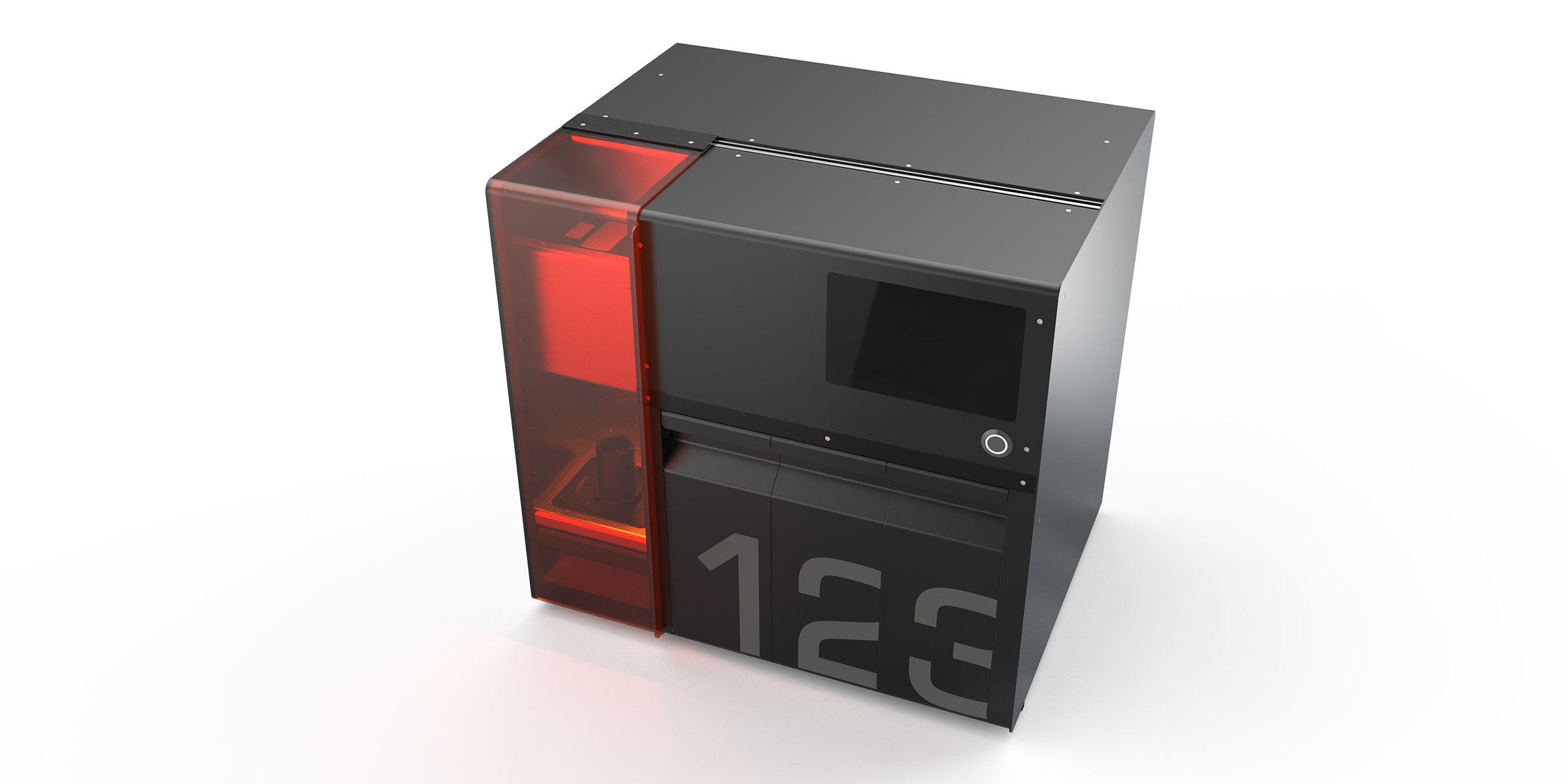 Abbildung 1: Aktueller Prototyp des kompakten Vollautomaten (Maße: L 53 cm, B 41 cm, H 50 cm) zur Produktion kolloidaler Nanopartikel. Designt bei Projekter Industrial Design. © Projekter Industrial Design GbR (Duisburg)