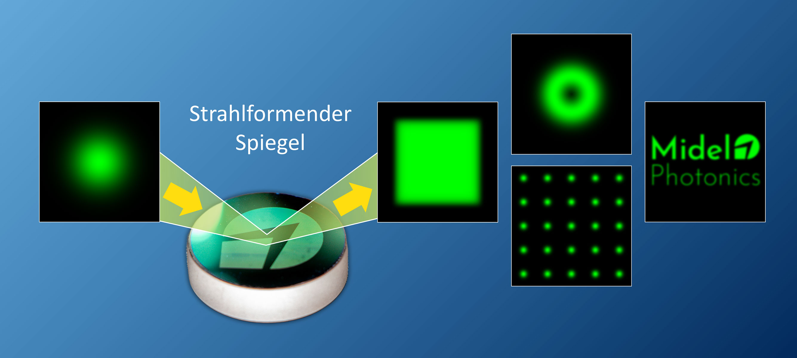 Laserstrahlformung ist heute bereits möglich. Mit Hilfe diffraktiver optischer Elemente lassen sich komplexe Strahlprofile realisieren. Das Verfahren basiert auf dem physikalischen Prinzip der Diffraktion, indem die Phase des Laserlichts räumlich moduliert wird und sich so eine neue Strahlform ergibt. Geeignete Phasenmodulationen können durch mikrostrukturierte Elemente realisiert werden. Etablierte Verfahren zur Herstellung dieser Elemente sind bisher jedoch aufwendig und zeitintensiv, so dass Laserstrahlformung in der Industrie viel zu selten Anwendung findet. Zukünftig werden besonders flexible Lösungen von der Strahlformentwicklung bis zum Einsatz benötigt. Das Start-Up „Midel Photonics“ an der Universität Bonn möchte dies durch eine eigens entwickelte Technologie nun ermöglichen.